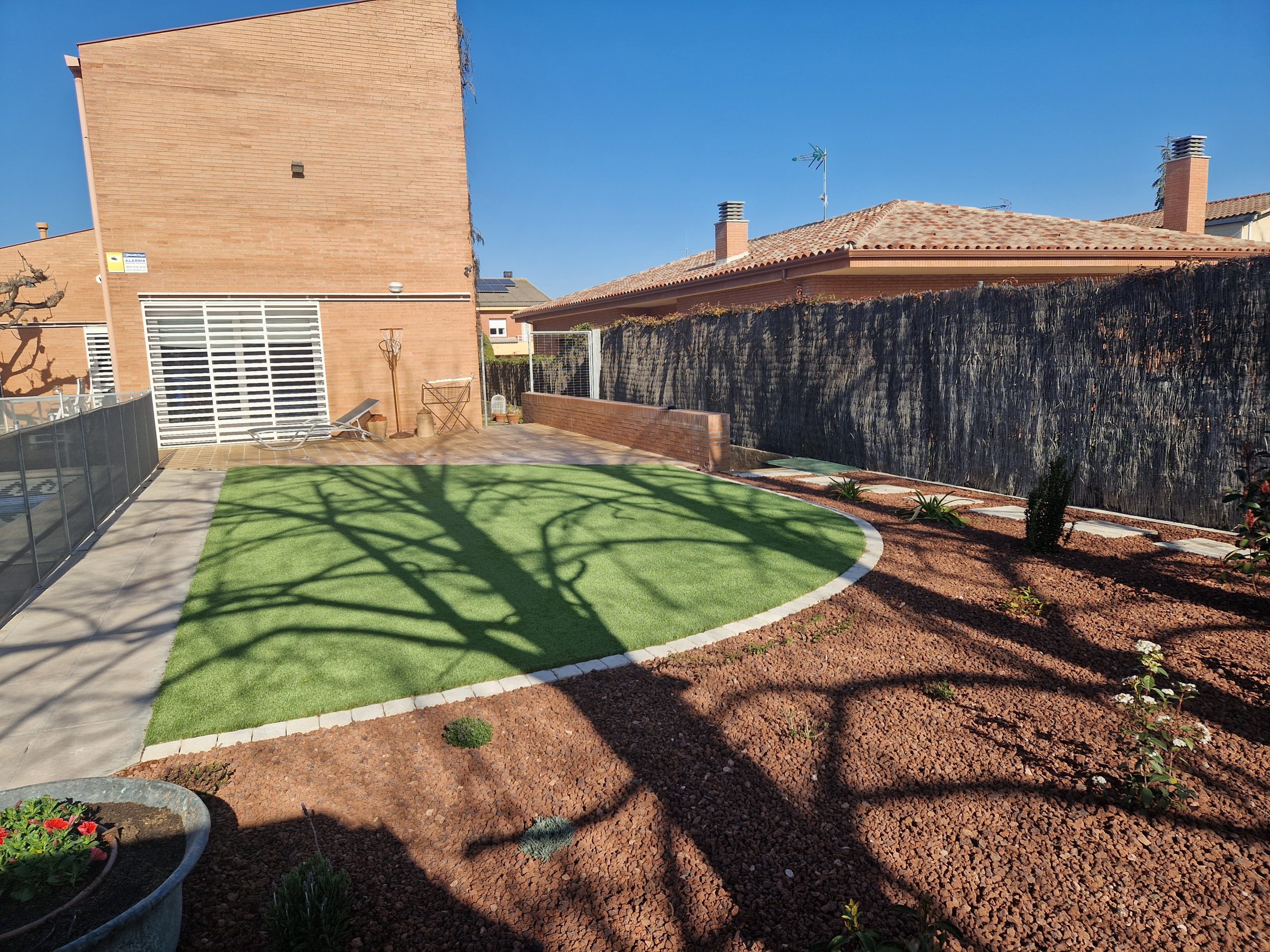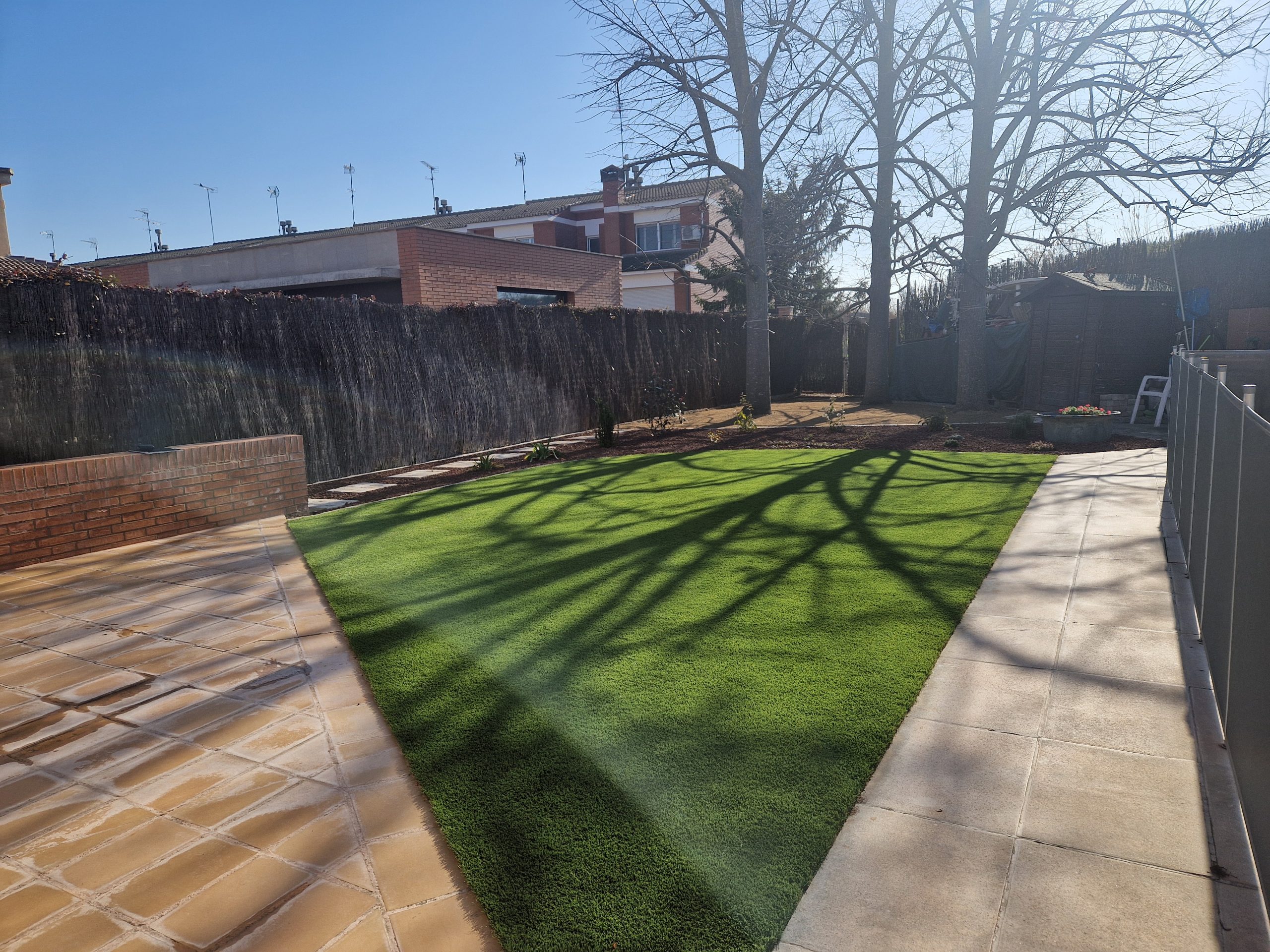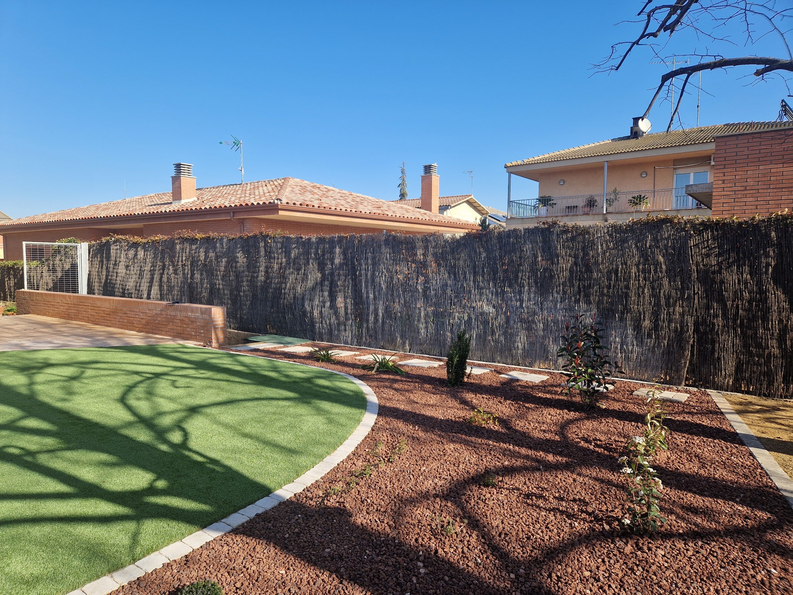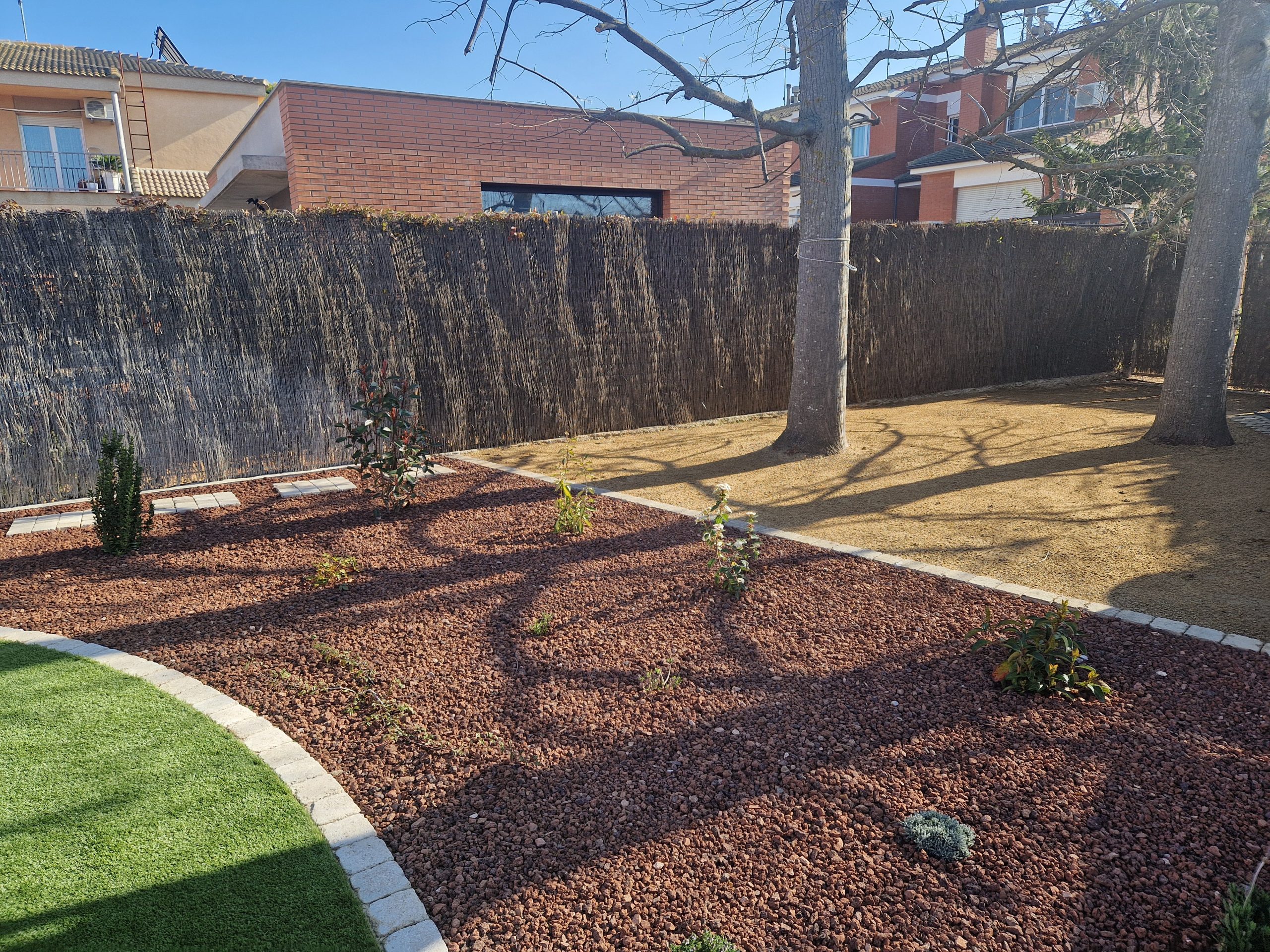 Enjardinament amb una combinació de gespa artificial Bermuda Gras 35 , marmolines, graves i zona de sauló.