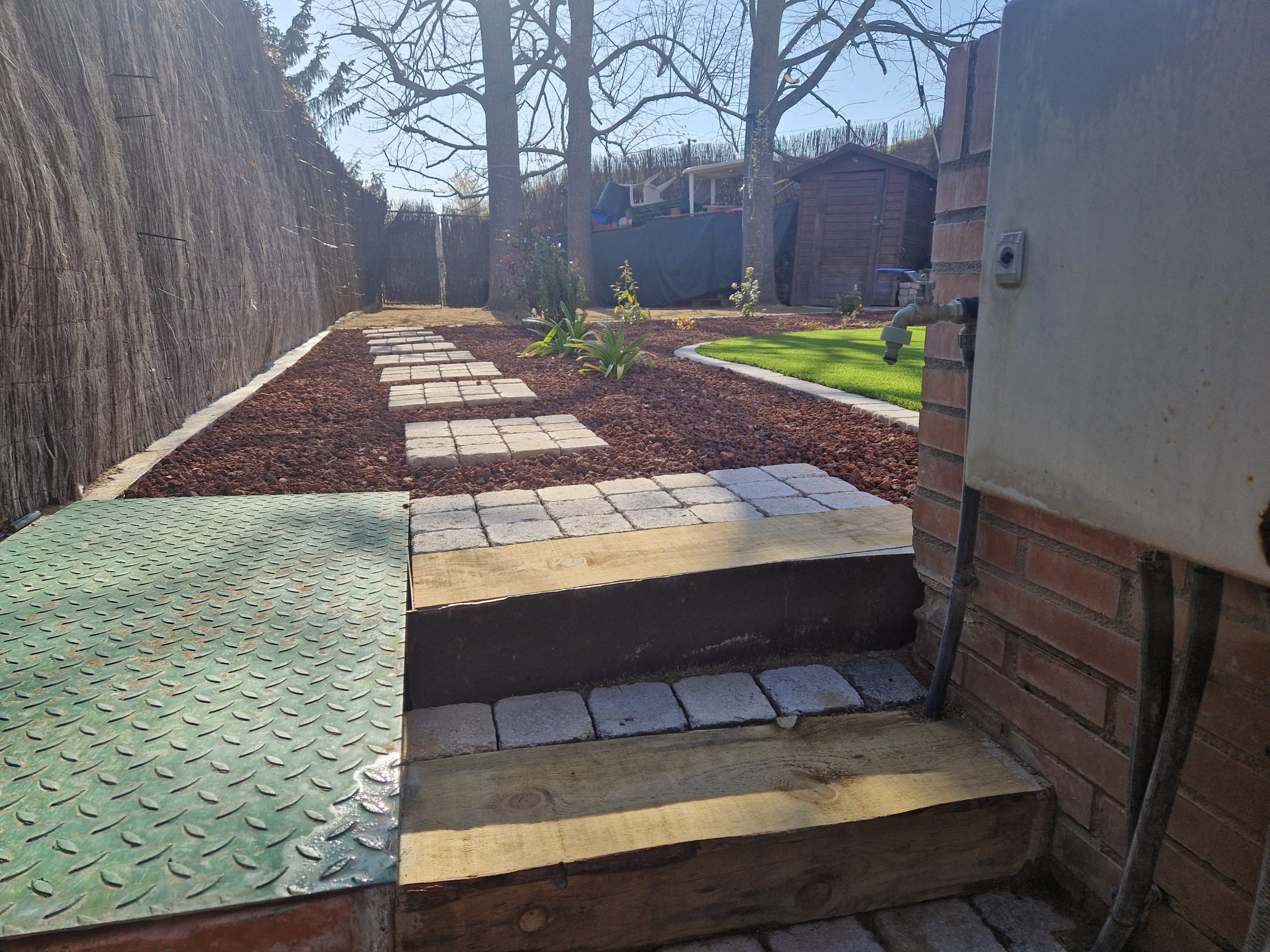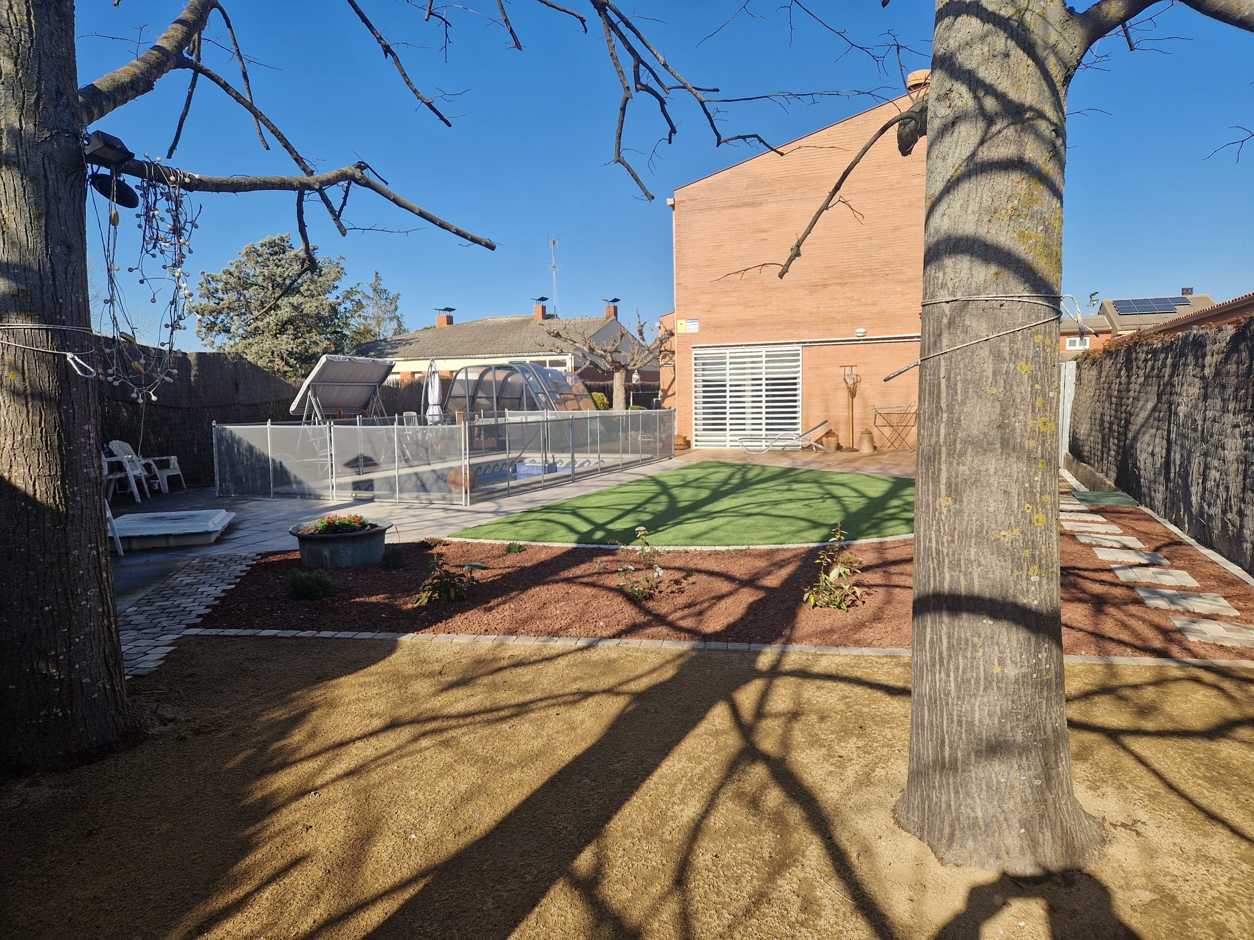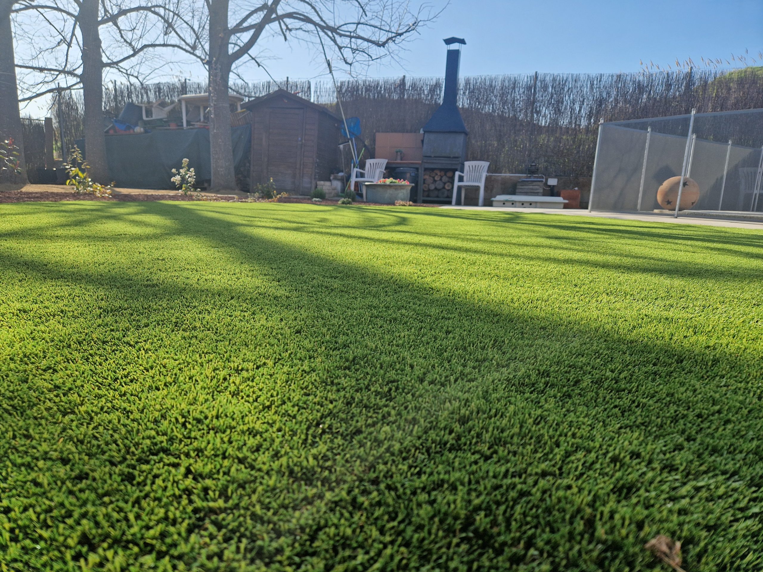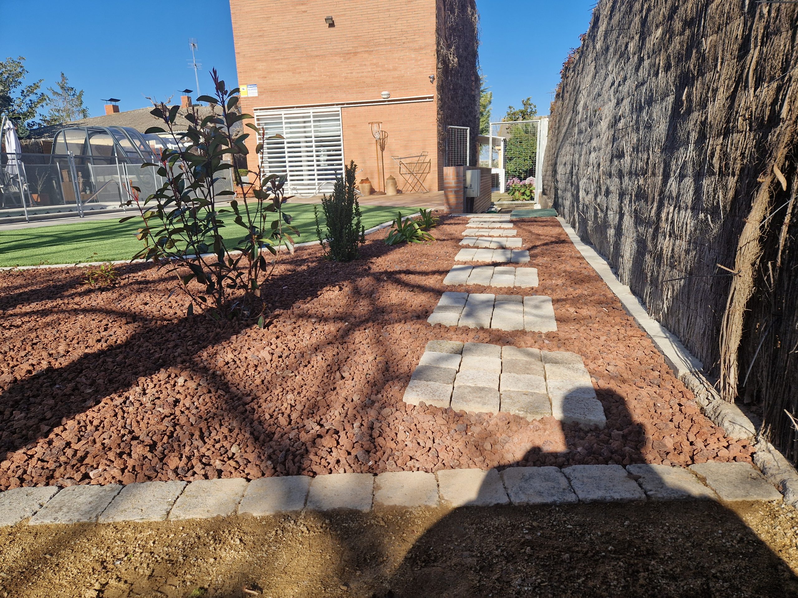 Enjardinament amb una combinació de gespa artificial Bermuda Gras 35 , marmolines, graves i zona de sauló.