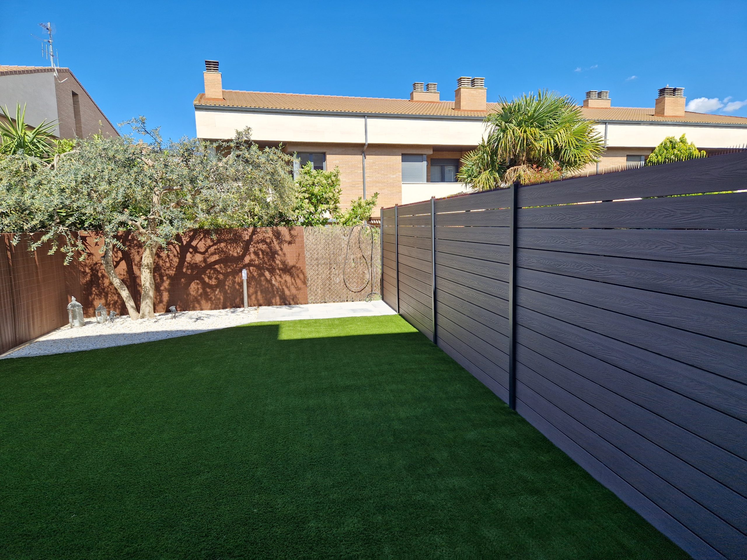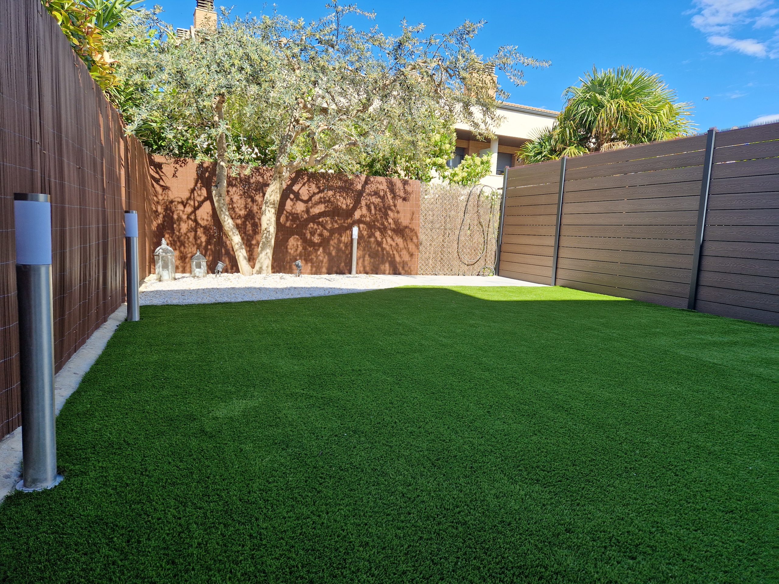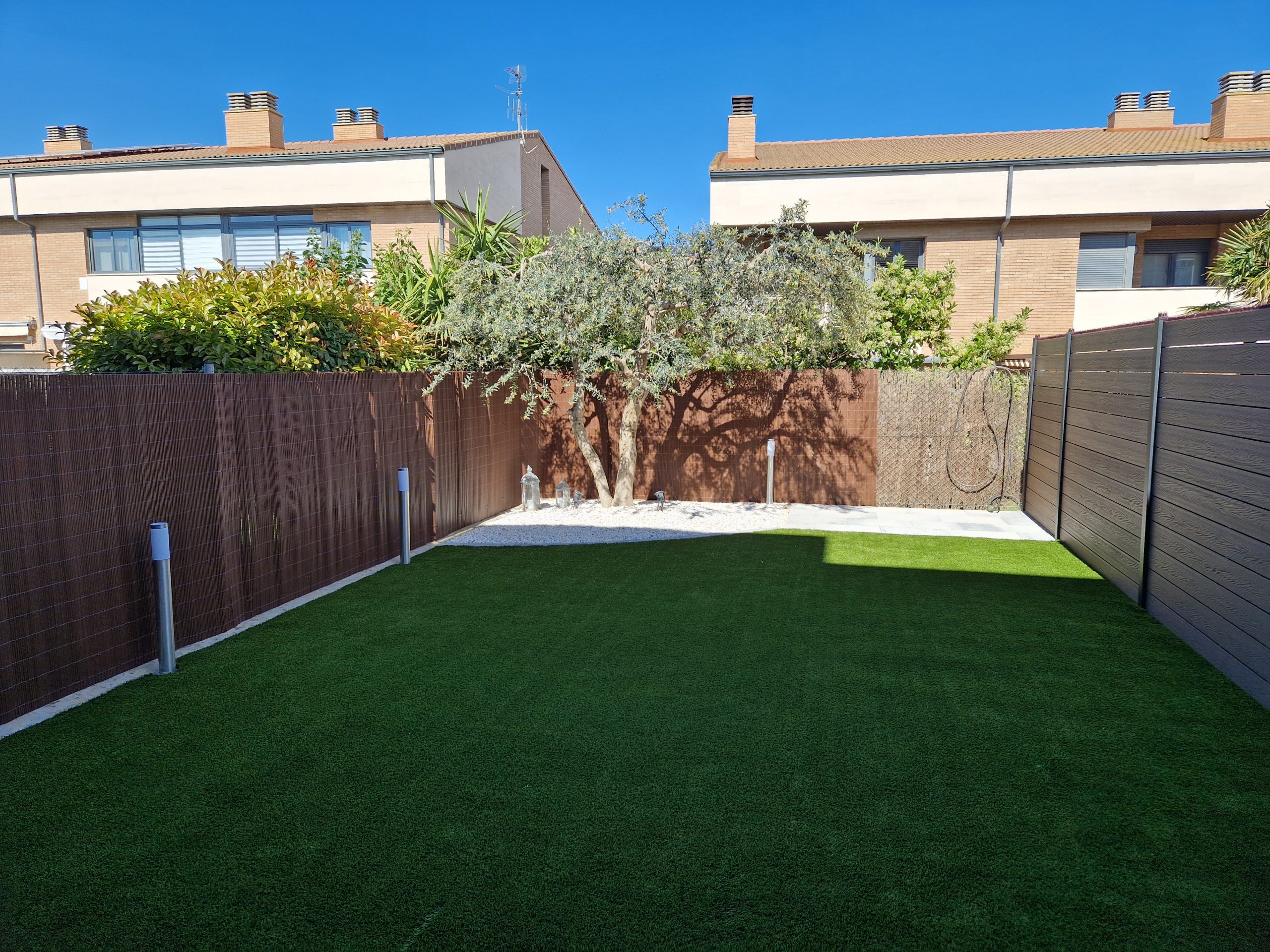 Enjardinament al poble d'Alpicat amb gespa Bermuda grass 35 de la marca VERDALIA. En aquest jardí ha estat necessari aportar força terra addicional per tal d'arribar al nivell adequat de la rajola de la terrassa. Una de les tasques mes importants alhora d'instal·lar la gespa artificial es la preparació del terreny, aportant terres especials compactables i ben anivellades.