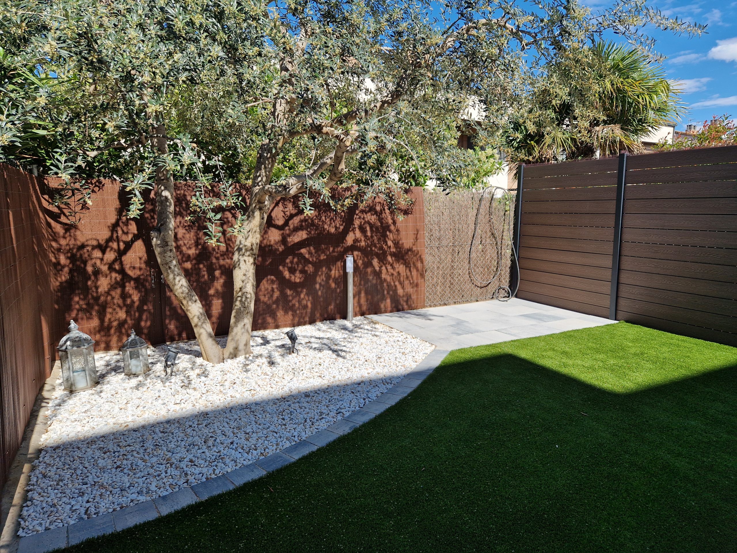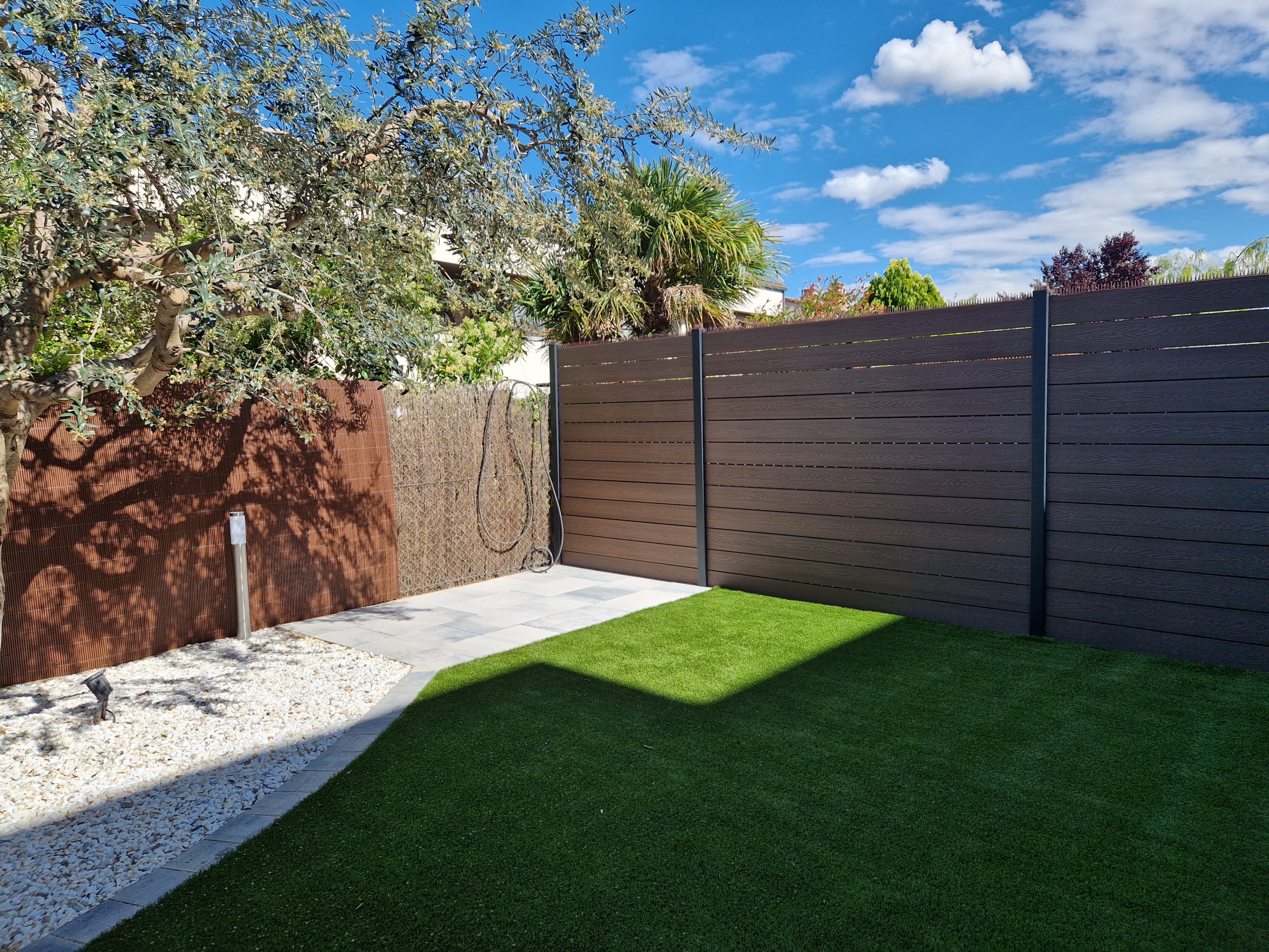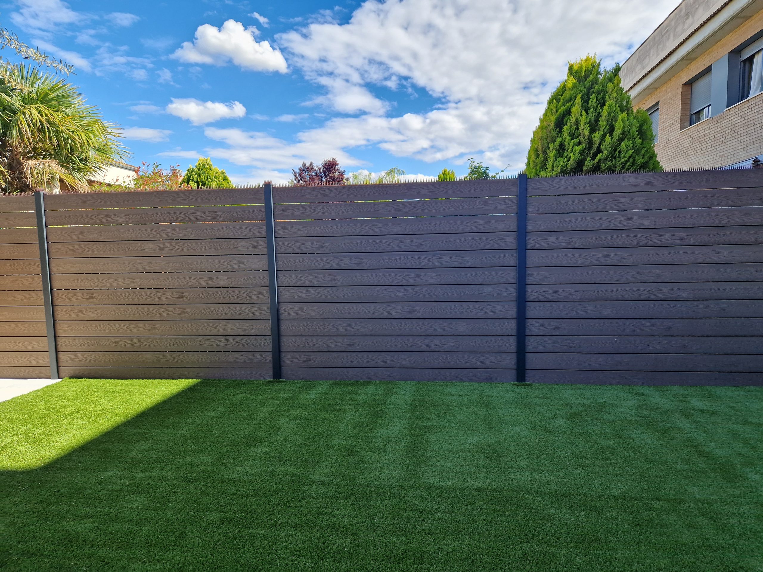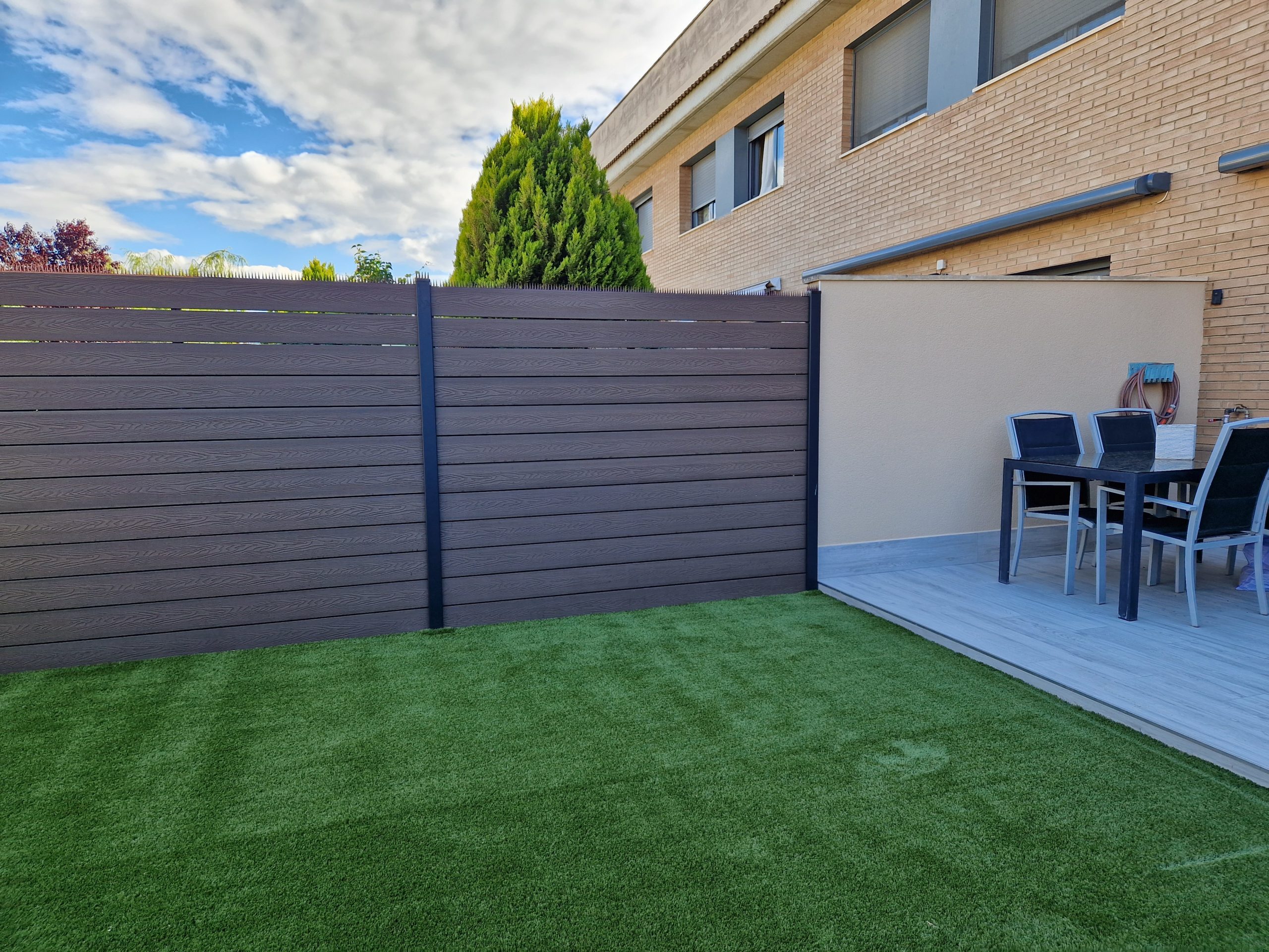 Enjardinament al poble d'Alpicat amb gespa Bermuda grass 35 de la marca VERDALIA. En aquest jardí ha estat necessari aportar força terra addicional per tal d'arribar al nivell adequat de la rajola de la terrassa. Una de les tasques mes importants alhora d'instal·lar la gespa artificial es la preparació del terreny, aportant terres especials compactables i ben anivellades.