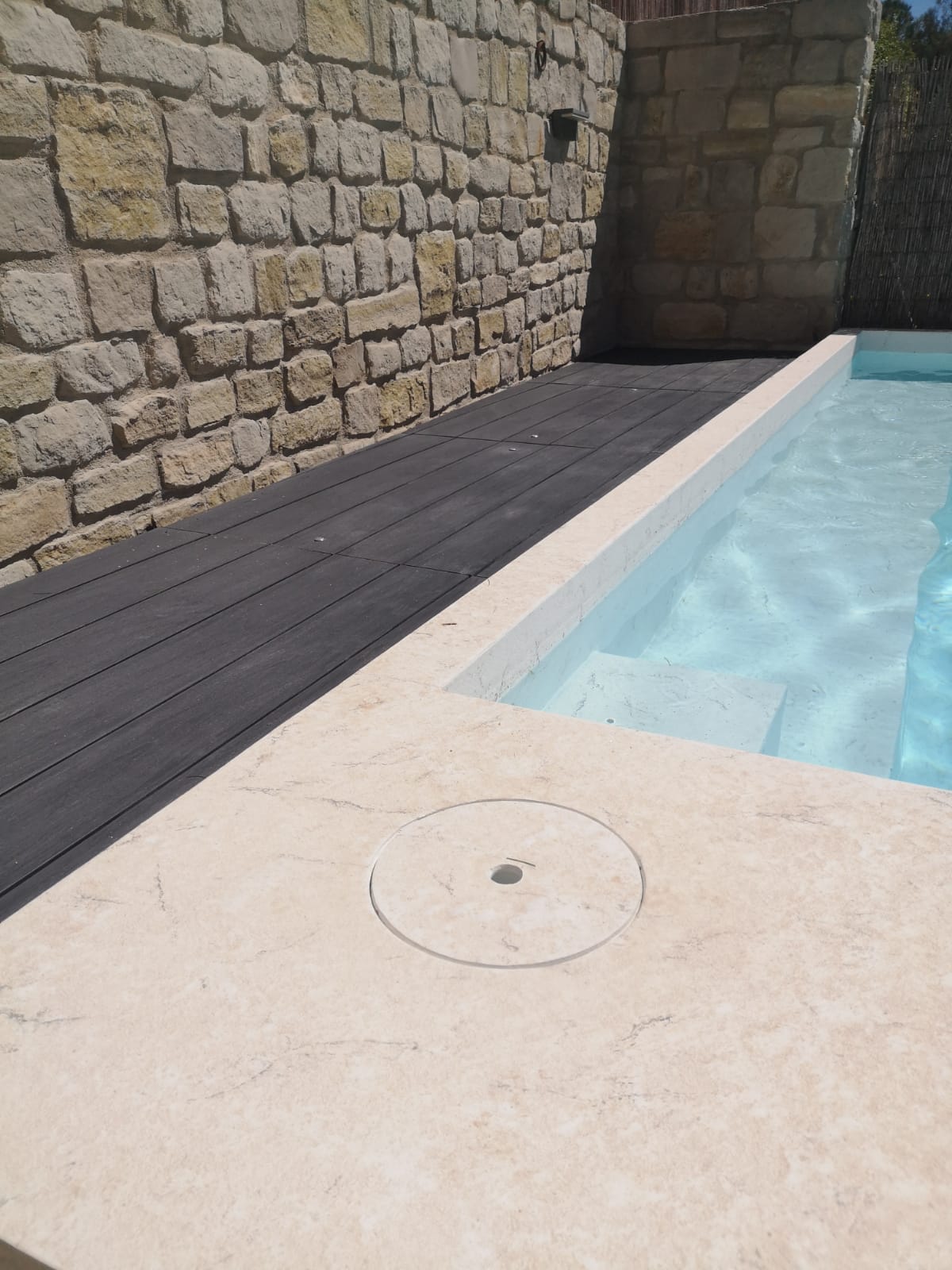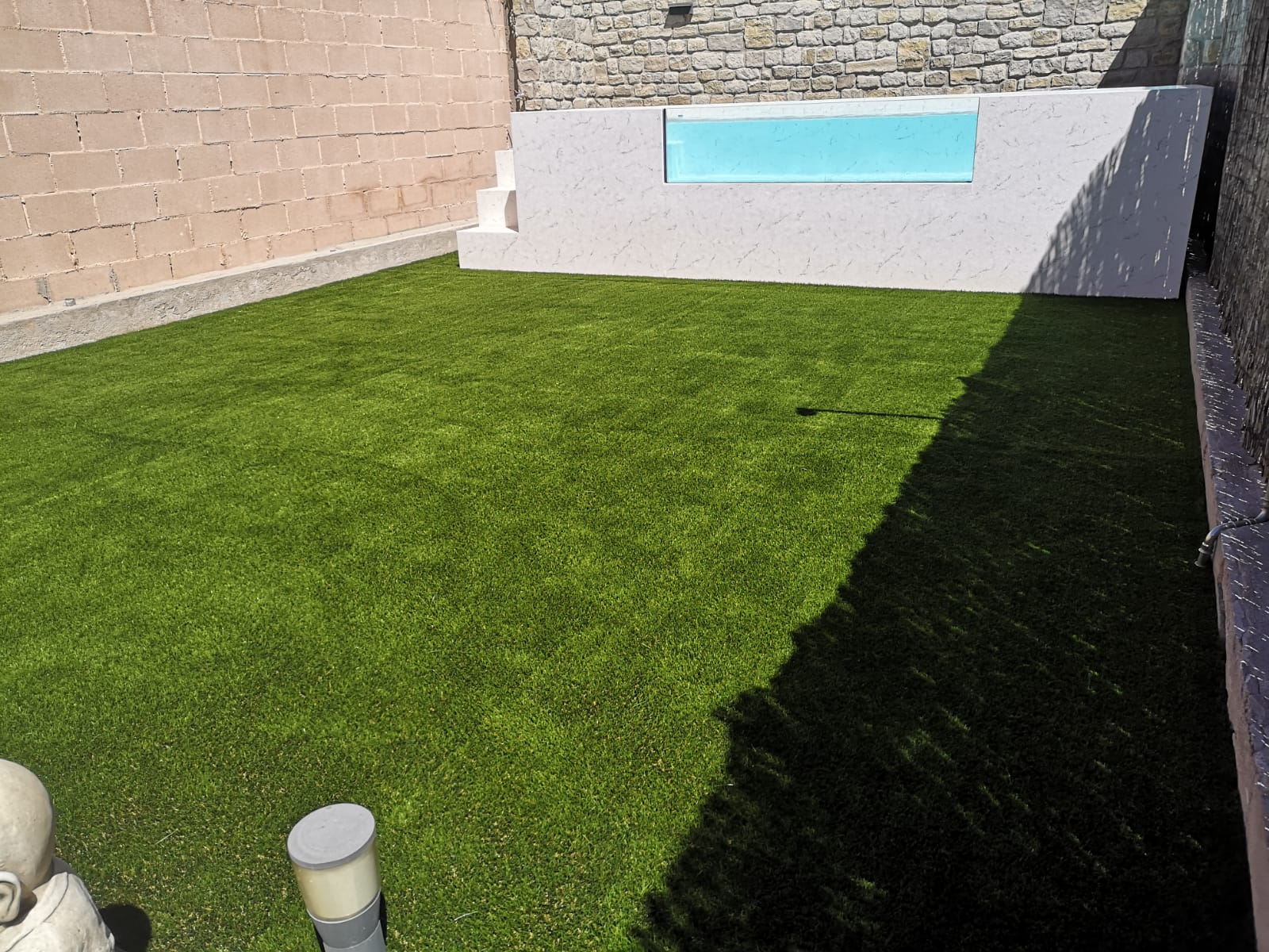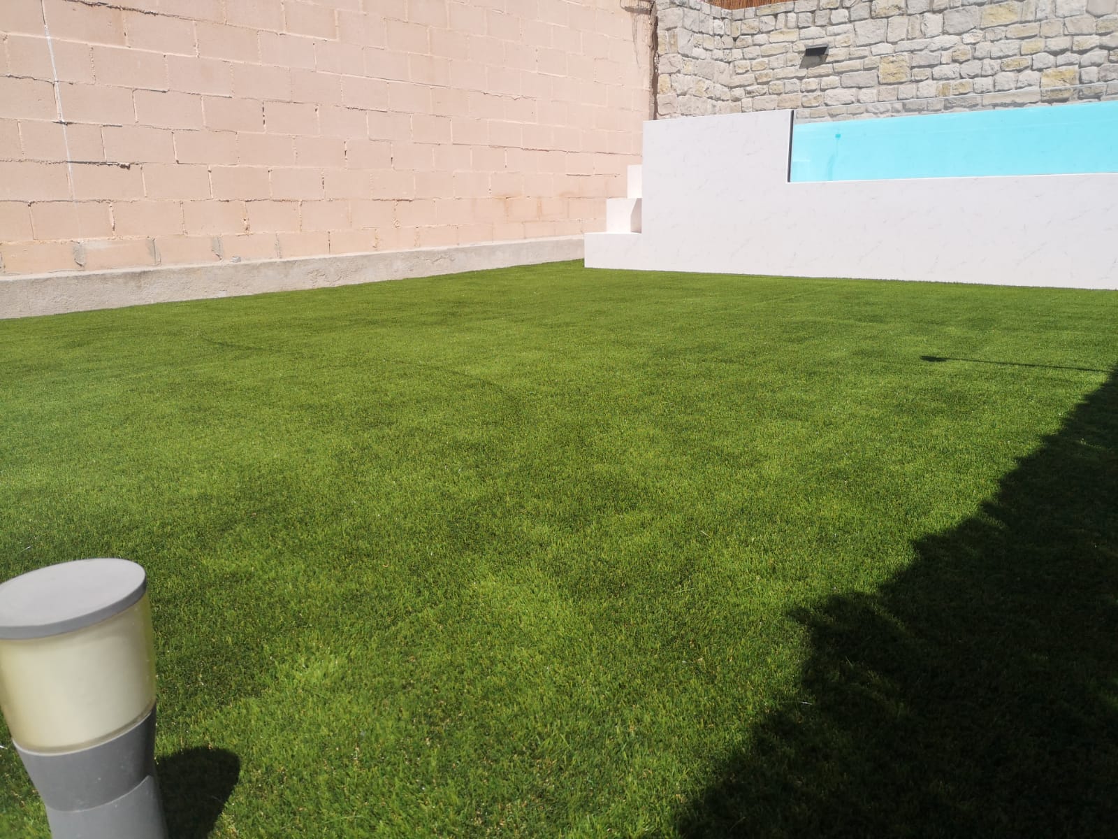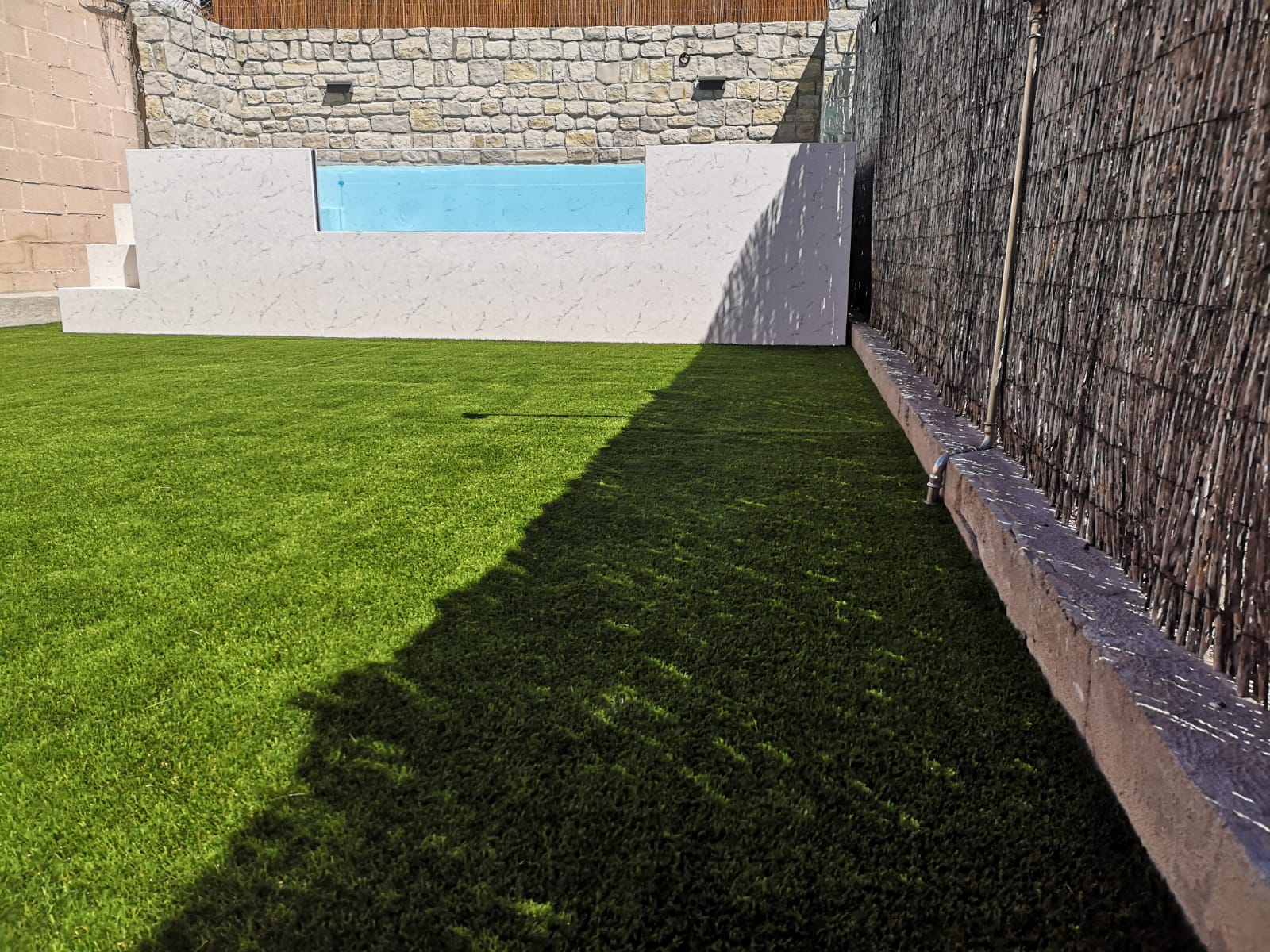 Client de la casa que fa una reforma i torna a instal·lar gespa artificial Bermuda Grass 35. Ha instal·lat una piscina i també s'ha aprofitat per fer un armari amb replà amb tarima sintètica.