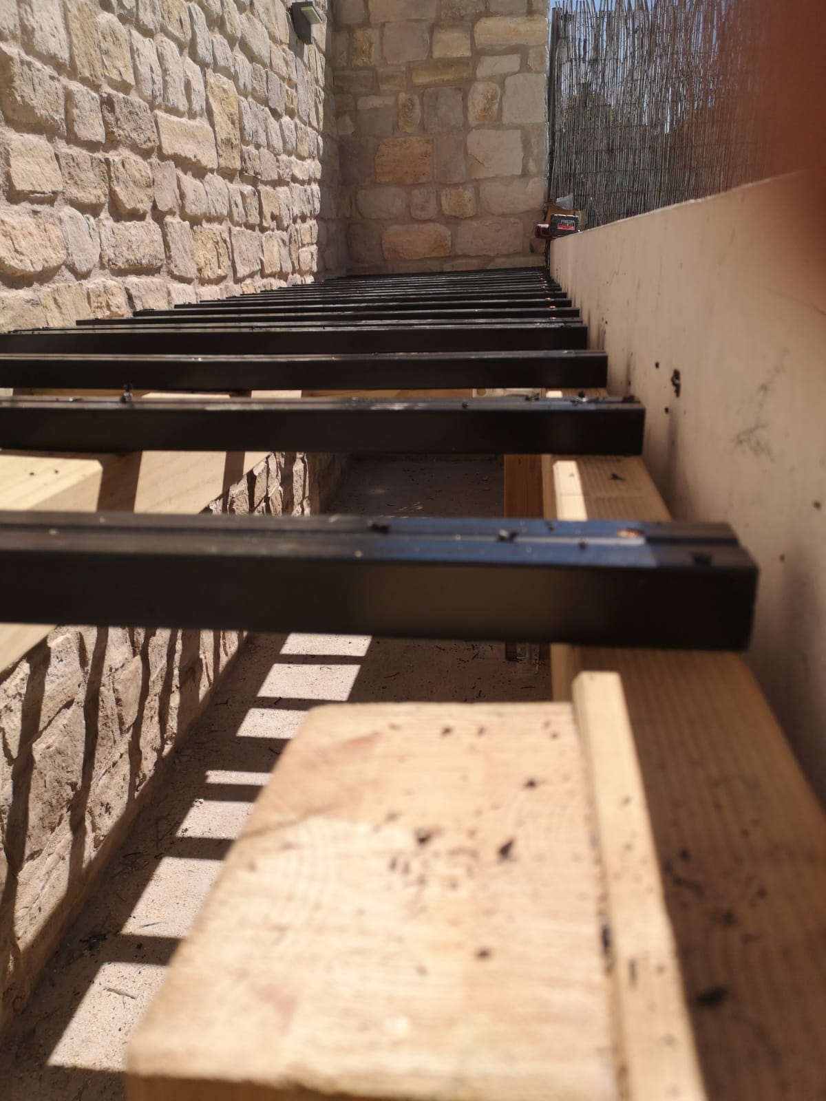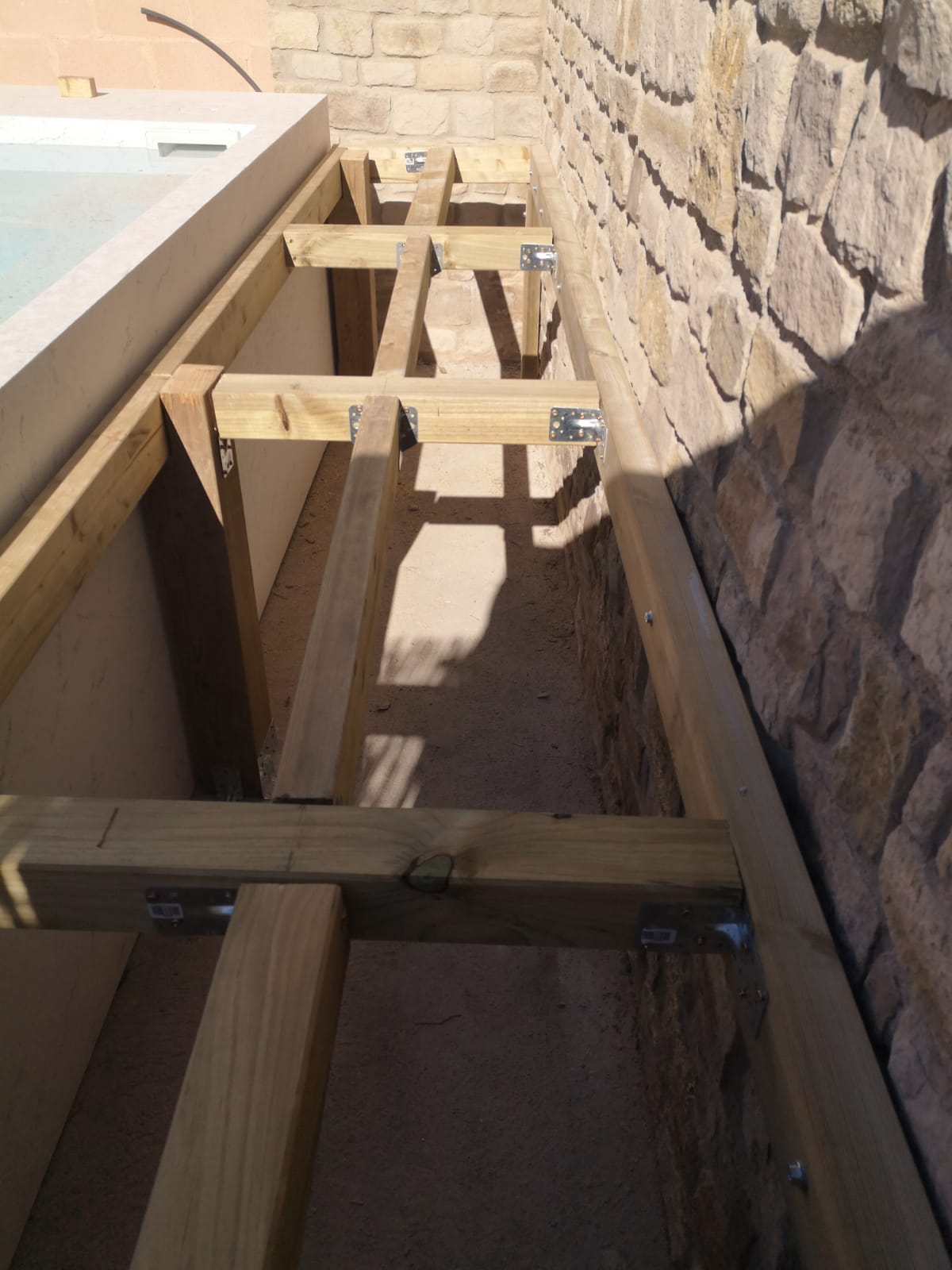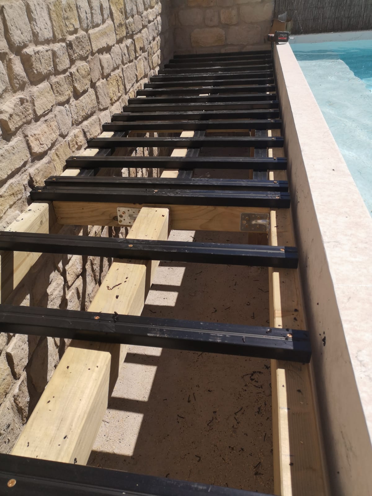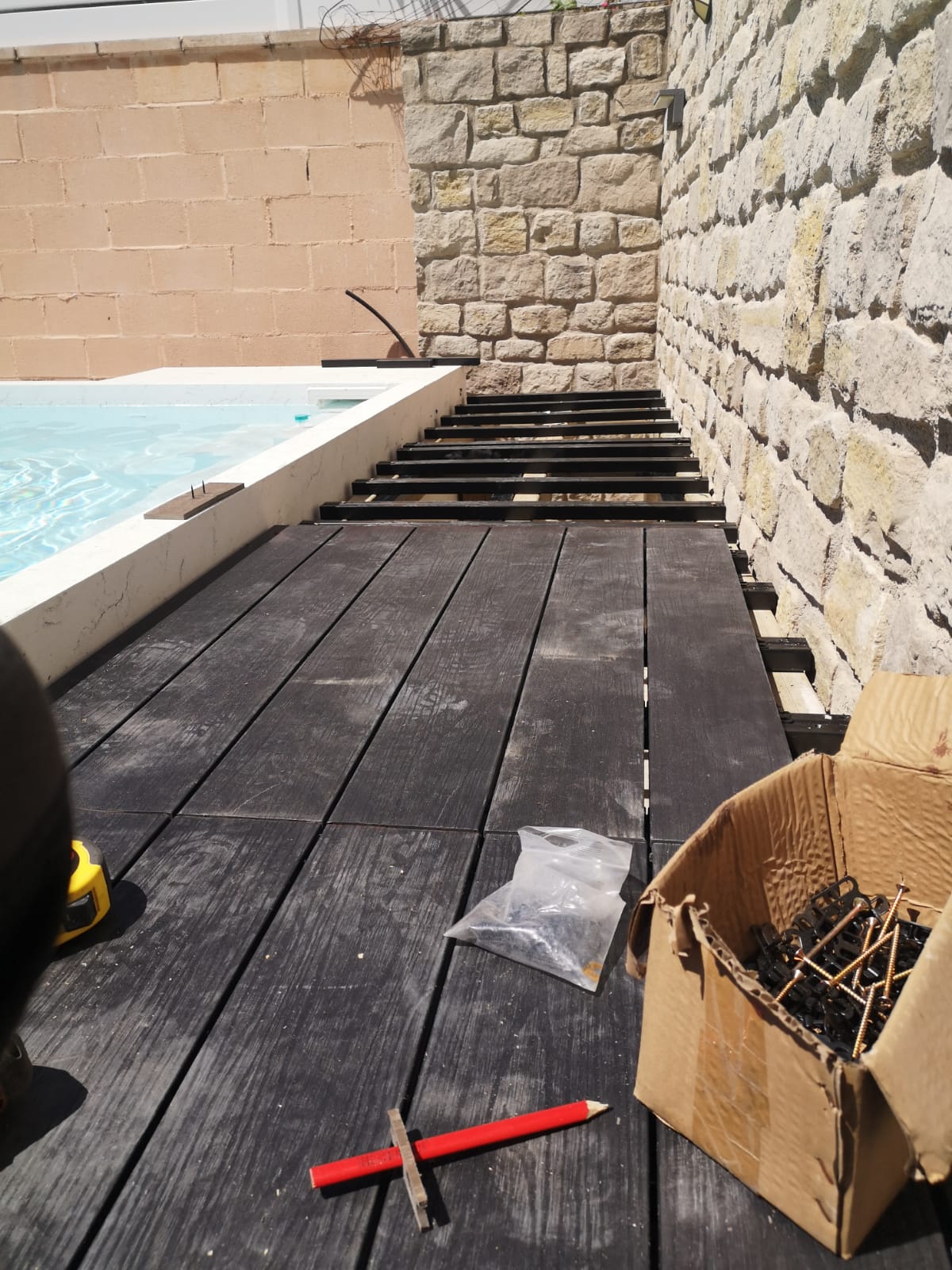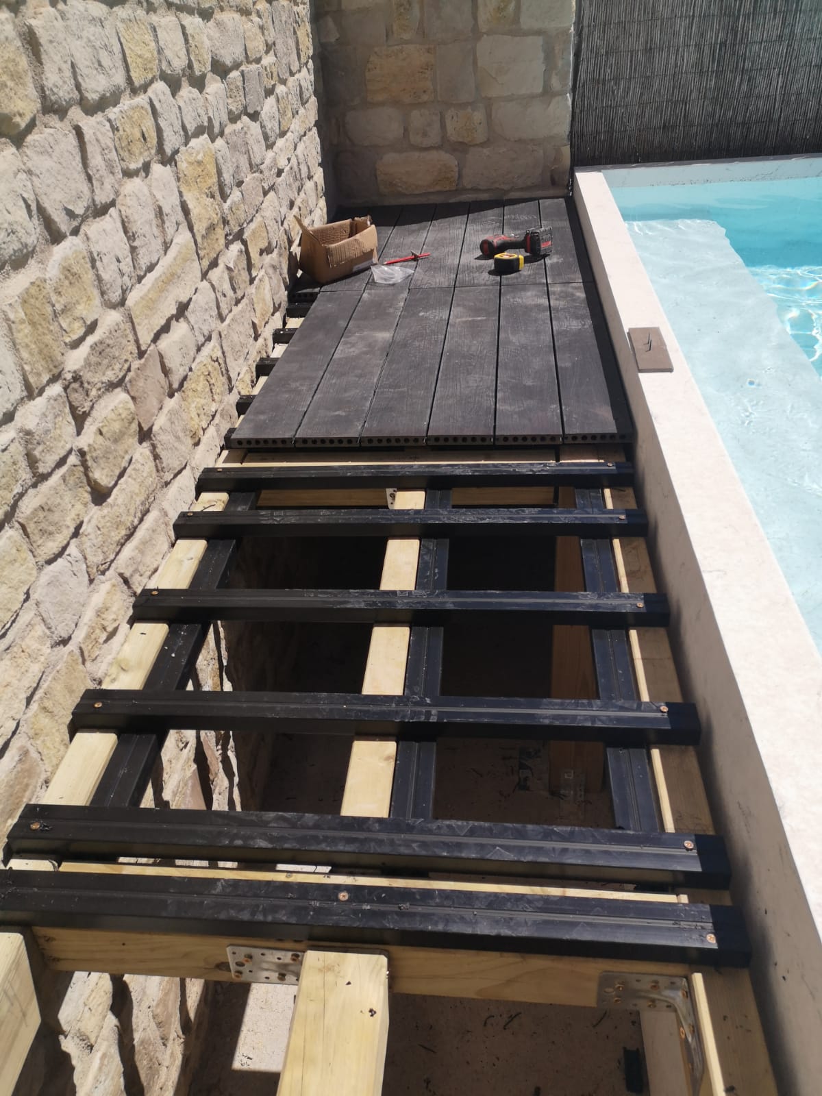 Client de la casa que fa una reforma i torna a instal·lar gespa artificial Bermuda Grass 35. Ha instal·lat una piscina i també s'ha aprofitat per fer un armari amb replà amb tarima sintètica.