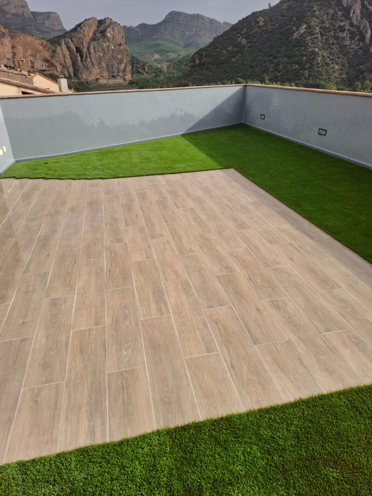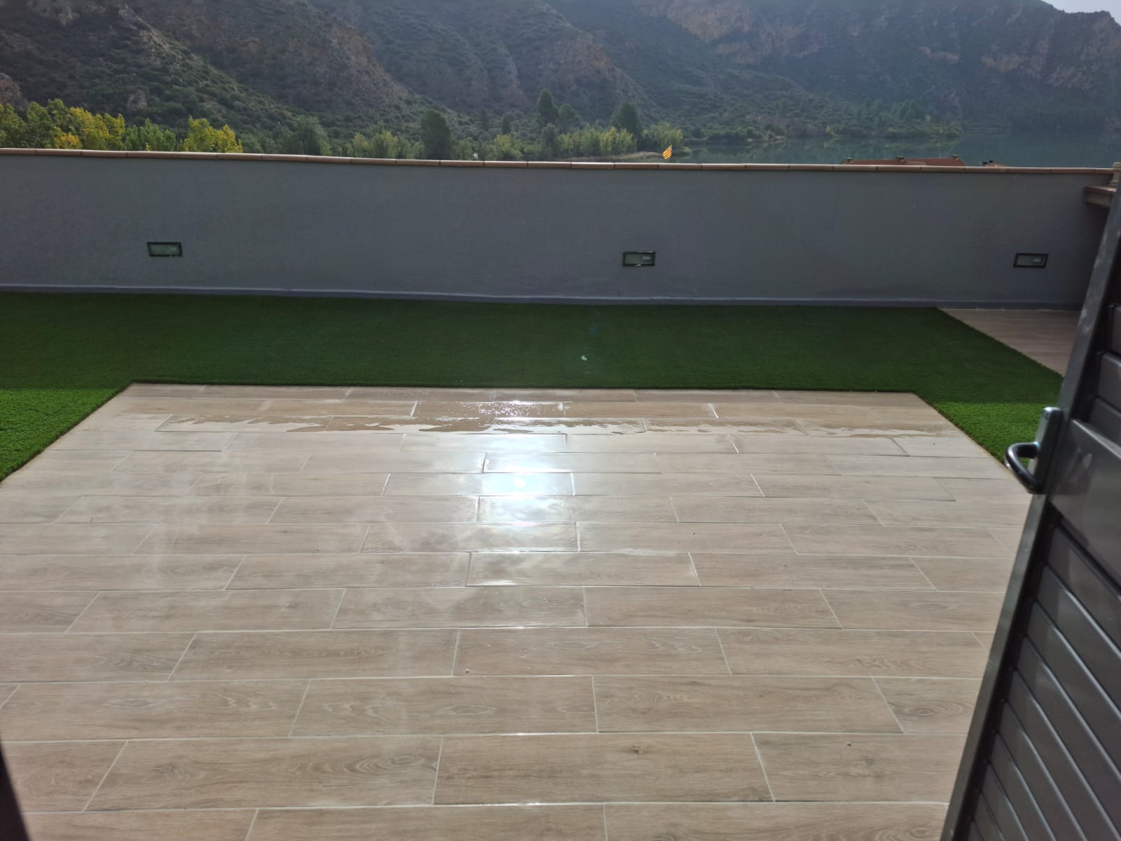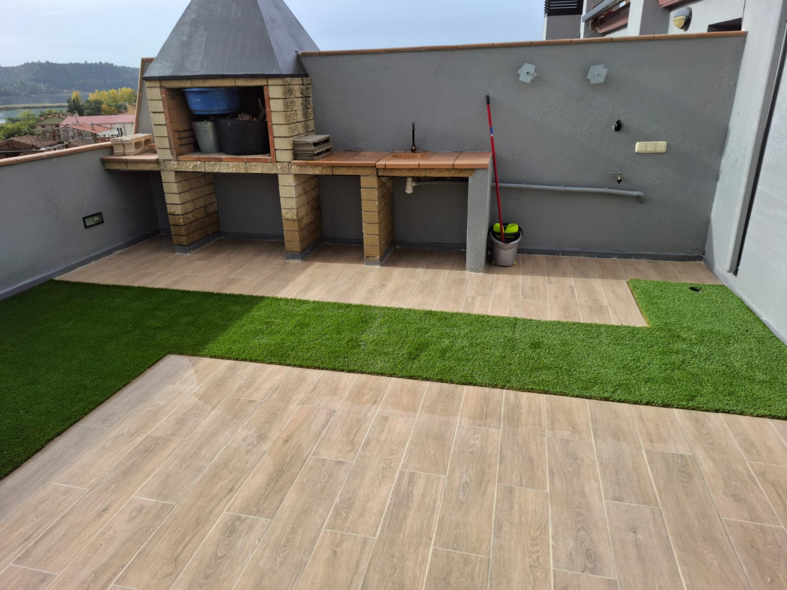 Terrassa amb vistes espectaculars al pantà de Sant Llorenç de Montgai. Primer em enrajolat amb porcelànic i després instal·lació de gespa artificial mod. Bermuda Gras 35