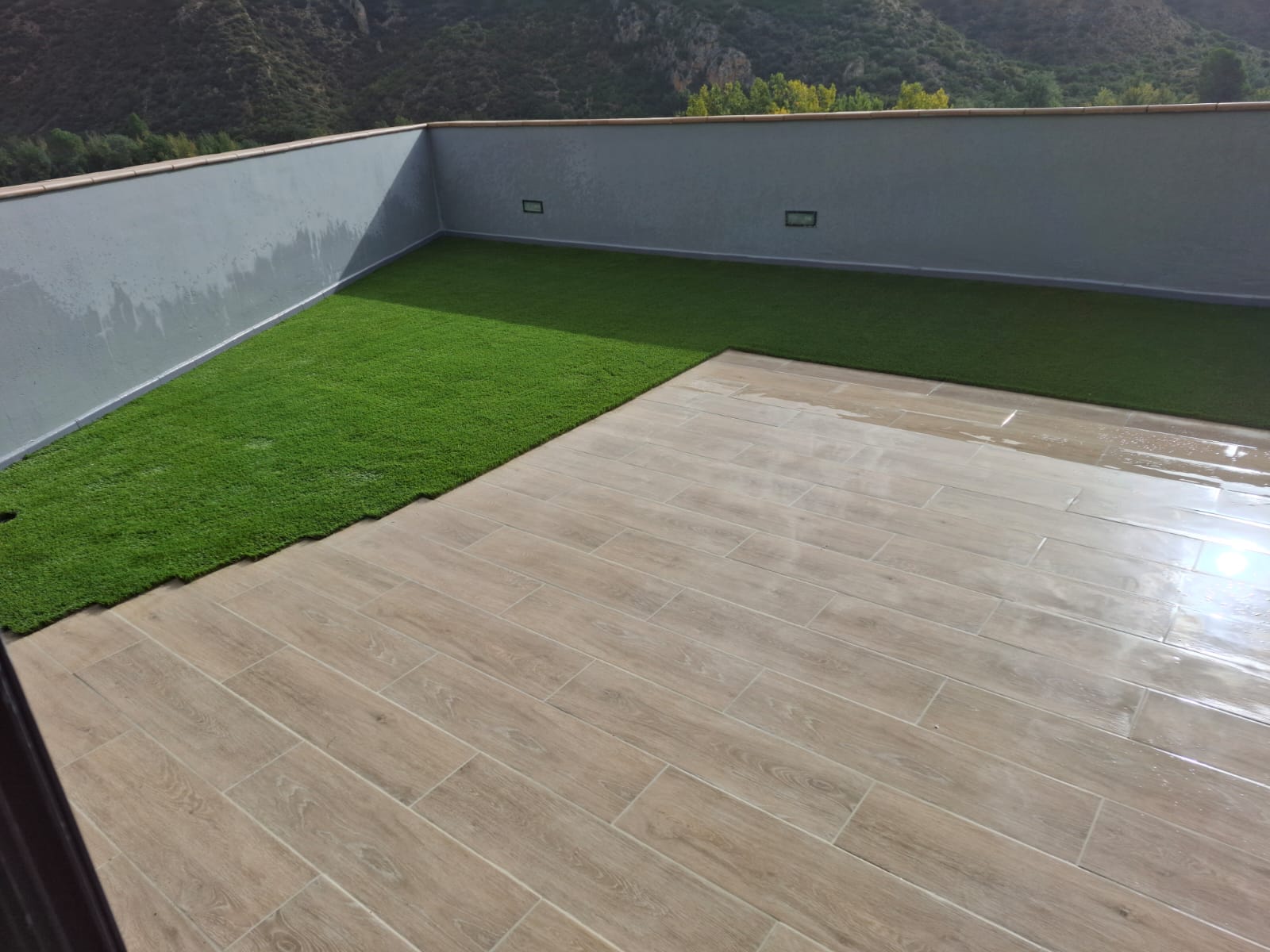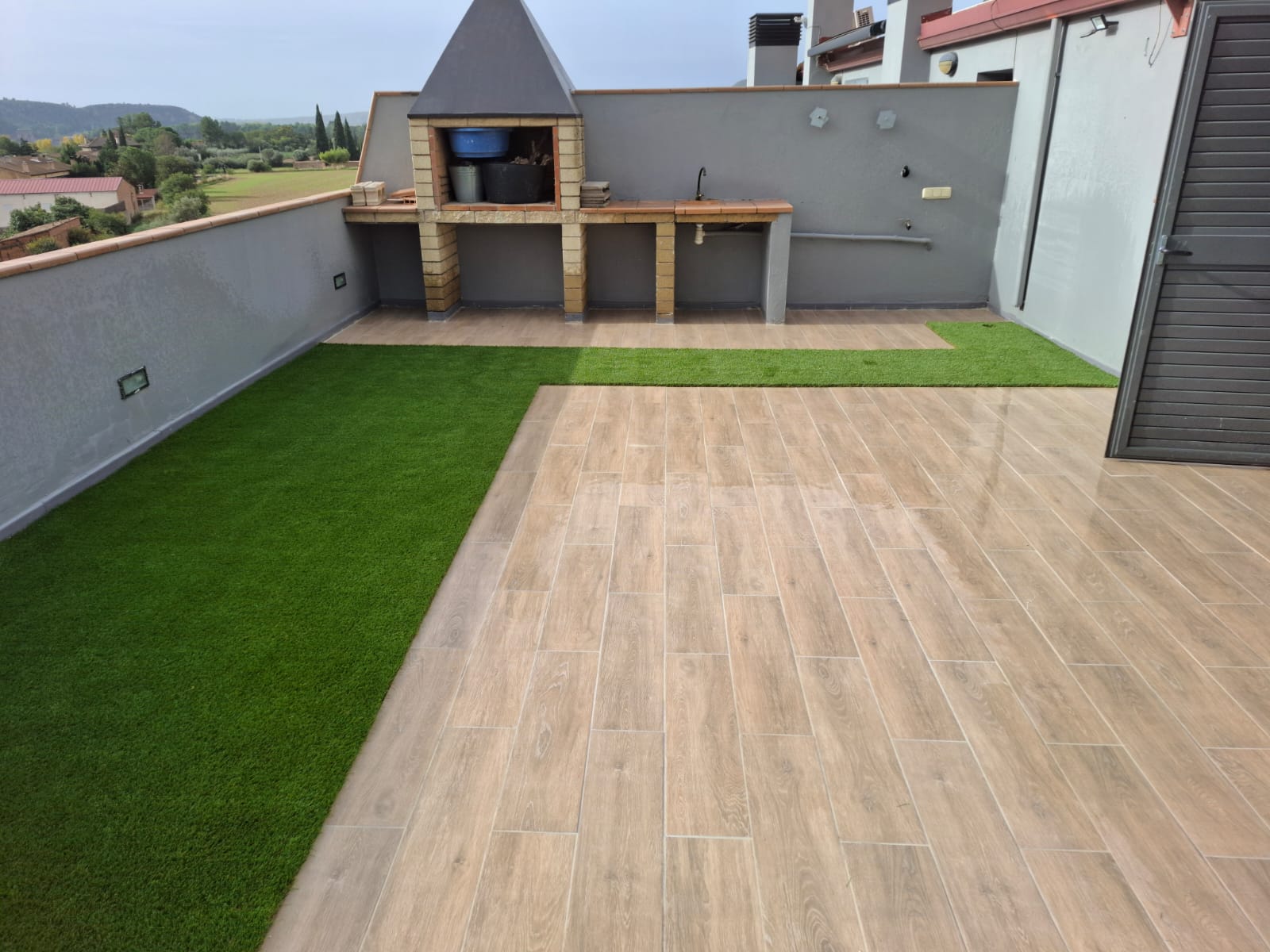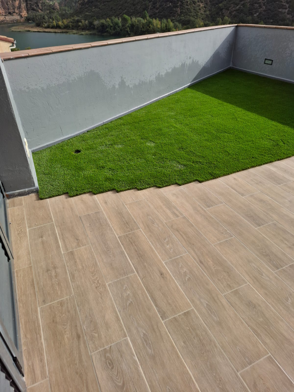 Terrassa amb vistes espectaculars al pantà de Sant Llorenç de Montgai. Primer em enrajolat amb porcelànic i després instal·lació de gespa artificial mod. Bermuda Gras 35